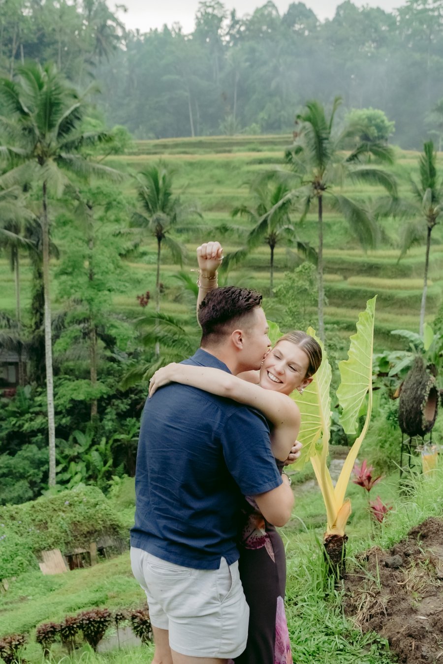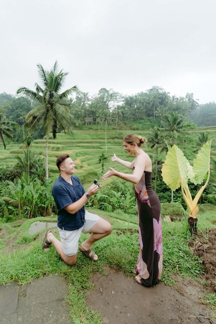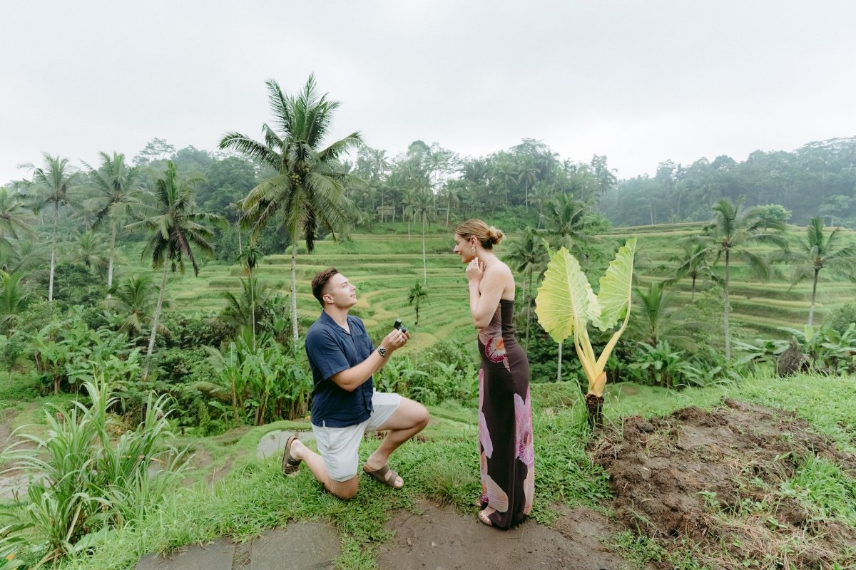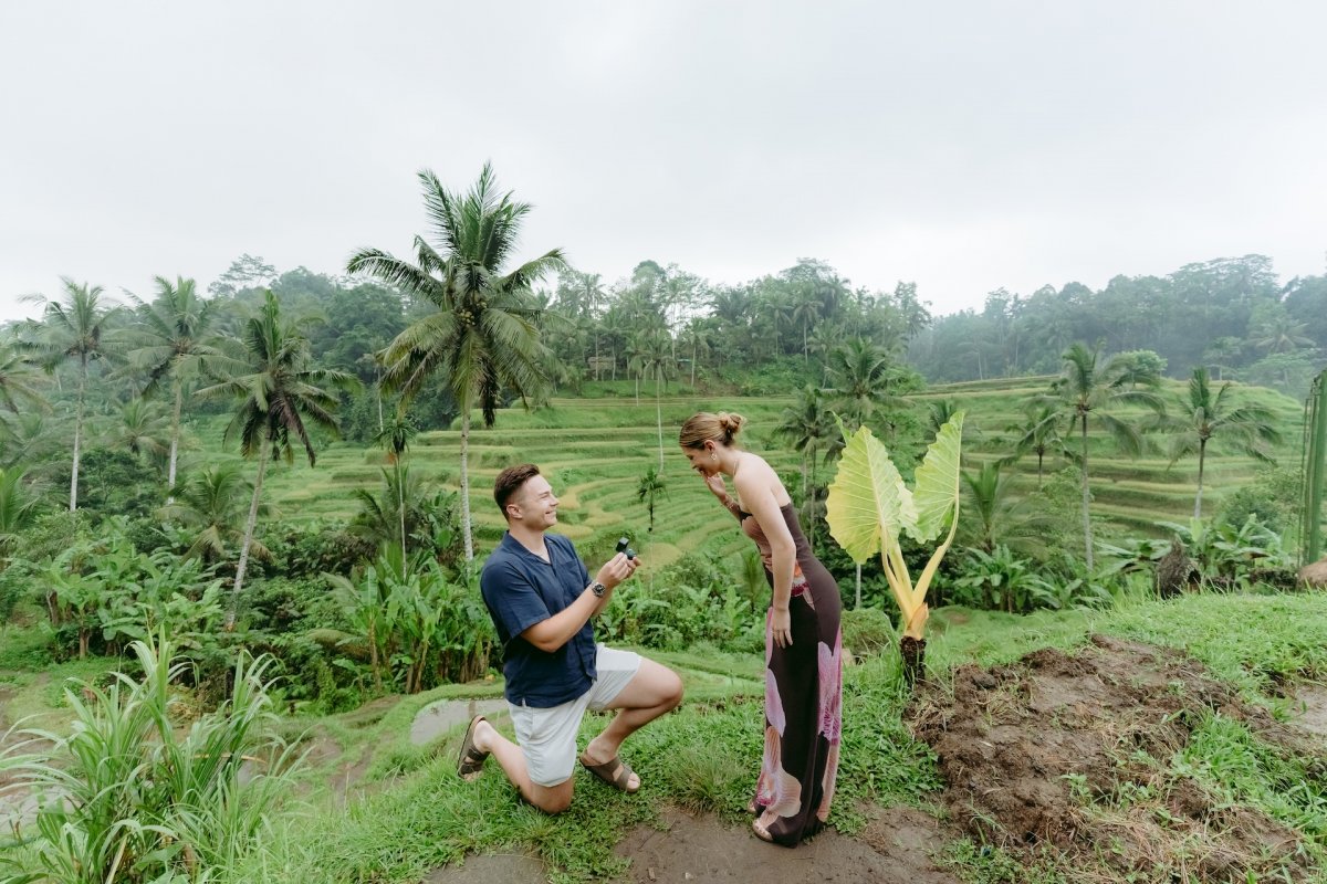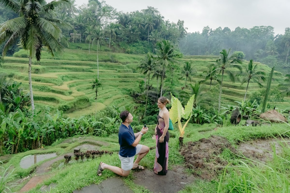 He arrange a surprise engagement to propose his fiancee , in Tegalalang rice terrace in Ubud  . Obviously the propose went pretty smooth since , his fiancee also very surprised with what Mr. Gin did at that day , It was a very cute reaction coming from both of them which make us as AiMotion Bali Best Photographer , witness that moment also dip one or two drops of tears from our eyes . It was really unbelievable moment.